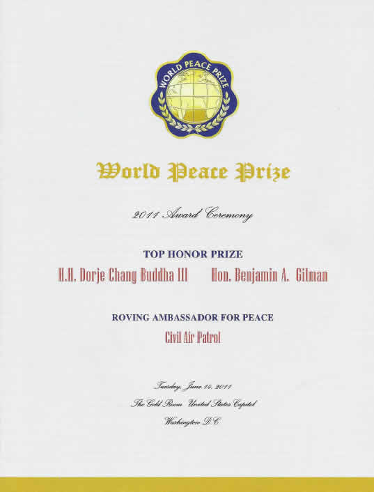 「世界和平奖」的「最高荣誉奖」,是颁发给卓著的世界领袖,和平先锋,他们致力于让来自不同背景的人,共同为和平而努力。第三世多杰羌佛,和本杰明‧吉尔曼先生昨天接受此殊荣。